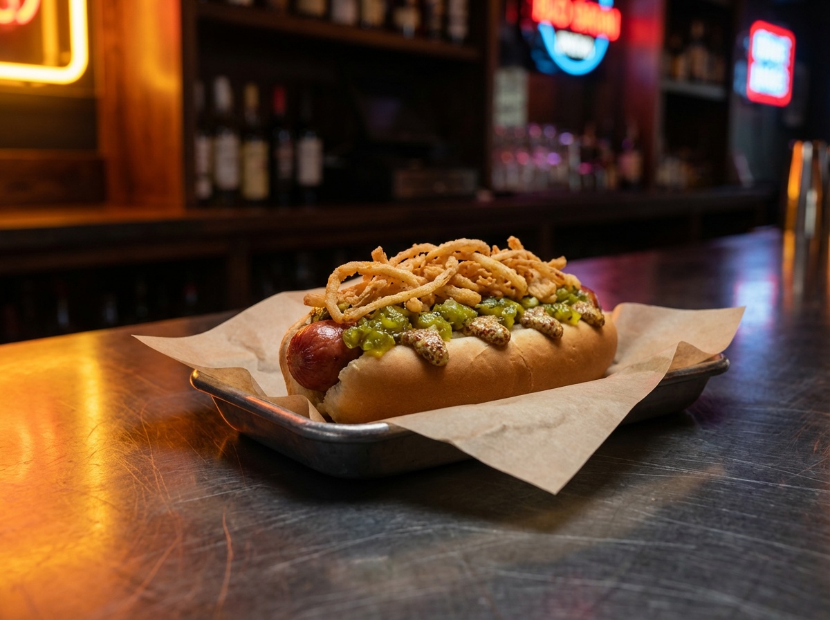 All-beef frank, house-made relish, spicy brown mustard, crispy onion straws